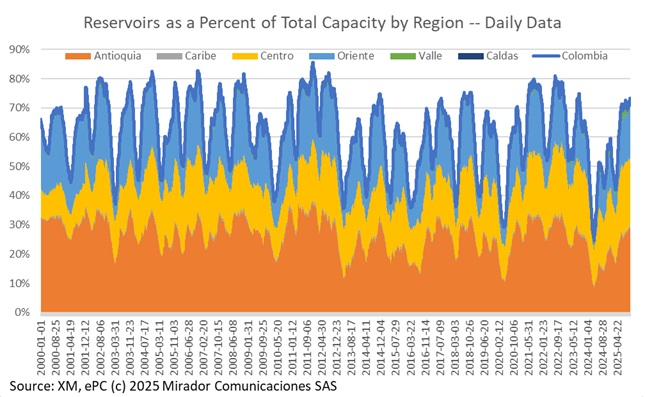 Read moreWe reported earlier this week that reservoir levels were improving behind hydro dams. Last time, that triggered MinEnergia to suggest / order XM to shift the matrix away from more expensive and dirtier thermal power. Is that happening? We also check in on solar, the third leg of the stool, to see what it is doing.